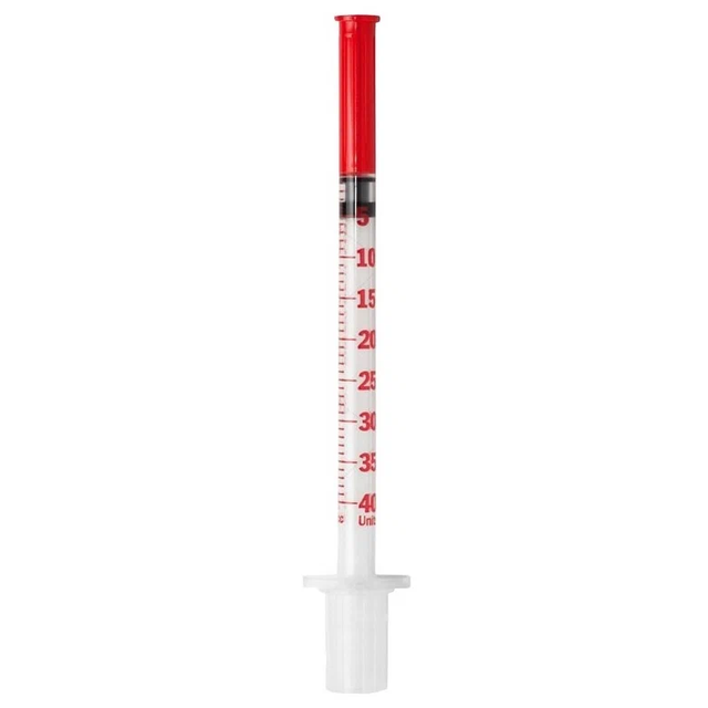 U-40 — це концентрація розчину інсуліну. Маркування U-40 означає, що в 1ml розчину міститься 40 одиниць інсуліну. У цьому шприці — 1 мл. Крок поділки шкали — 1 ЕД.